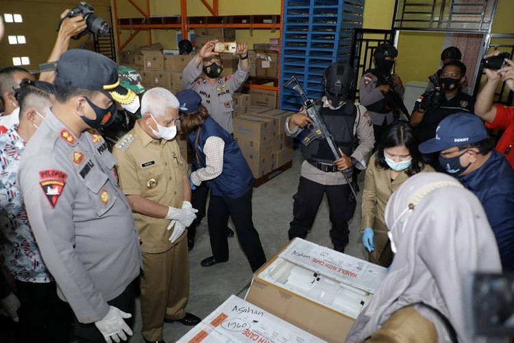 ASAHAN- Sebanyak 4.440 vial Vaksin Sinovac tiba di Asahan, dengan pengawalan ketat yang melibatkan unsur TNI-Polri. Vaksin untuk melindungi tubuh dari Covid-19 itupun langsung disimpan di gudang Instalasi Farmasi di Jalan Durian, Kisaran, Sumatera Utara.