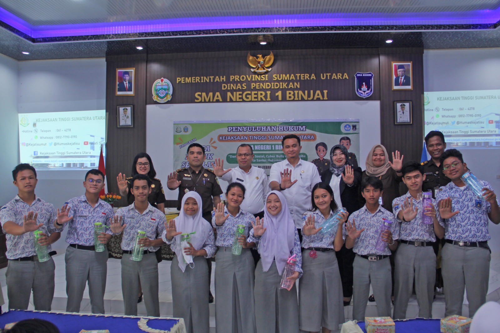 Penyuluhan hukum menghadirkan narasumber Kajati Sumut yang diwakili Kasi Penkum Yos A Tarigan, SH, MH dan Jaksa Fungsional Joice V. Sinaga, SH dengan topik ‘Dampak Media Sosial, Cyber Bully, dan Narkoba serta Sanksi Hukumnya. Kepala Sekolah SMA N 1 Binjai Syahfrizal Tarigan, S. Pd, M. Pd didampingi Kacabdis Provsu untuk wilayah Binjai Stabat Junanda, S.Pd, M.Ed dan Kabag TU Cabdis Drs. Syarifuddin menyambut baik program Jaksa Masuk Sekolah Kejati Sumut memberikan edukasi dan pemahaman kepada 90 orang siswa perwakilan dari SMA N 1 Binjai terkait topik yang diusung.
