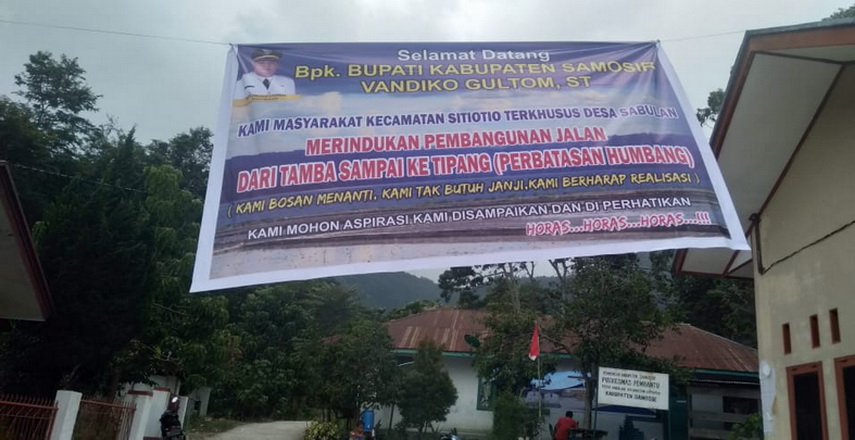 Spanduk oleh masyarakat Desa Sabulan itu bertuliskan, “Selamat datang Bapak Bupati Kabupaten Samosir Vandiko Gultom ST. Kami masyarakat Kecamatan Sitiotio terkhusus Desa Sabulan merindukan pembangunan jalan dari Tamba Sampai ke Tipang (Perbatasan Humbang). Kami bosan menanti, kami tak butuh janji, kami berharap realisasi.”