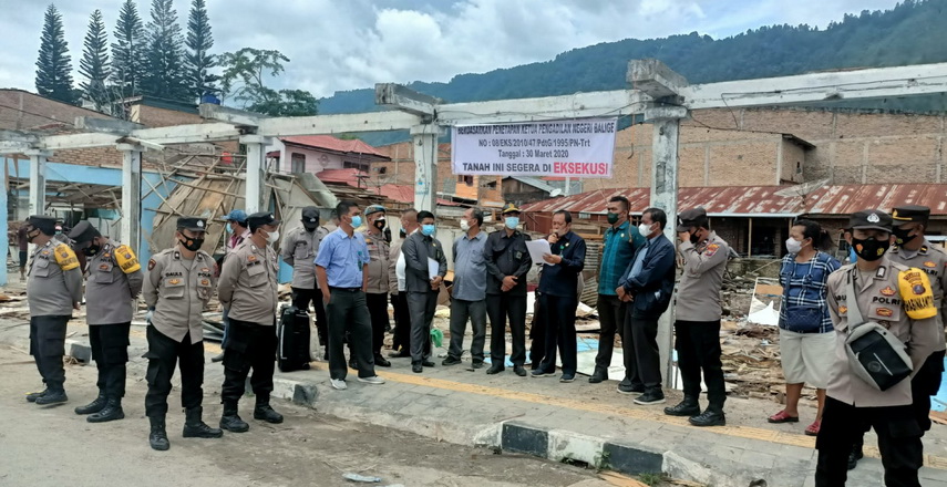 Bangunan tersebut selama ini merupakan tempat jual beli dagangan souvenir khas Samosir. Terlihat hadir panitera dari PN Balige Provinsi Sumatera Utara, Hotman Sinaga dan Leo Tampubolon.