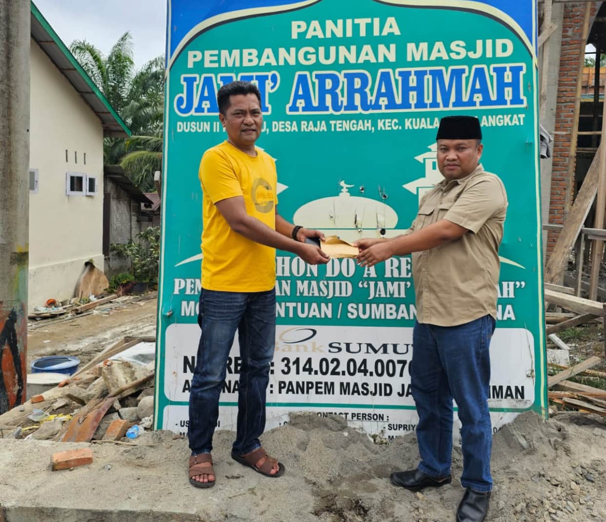 Langkat – Sekretaris DPD Gerindra Sumut Sugiat Santoso memberikan bantuan untuk pembangunan Masjid Jami Ar Rahmah yang berada di Dusun II Kp Baru, Desa Raja Tengah, Kecamatan Kuala, Kabupaten Langkat.