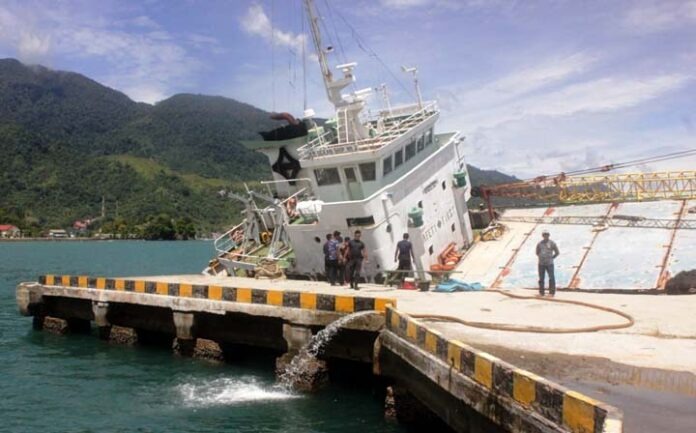 TAPAKTUAN – Kapal Motor Ocean Ship 2 yang dikelola PT. Pelayaran Kartika Samudera Indah (KSI) beralamat Sibolga, nyaris tenggelam di Pelabuhan (Cerocok) Tapaktuan, Jumat (25/9/2020) lalu. Pasalnya, kapal pengangkut semen kantongan bertonase 675 Gross Ton (GT) yang bersandar di Dermaga Unit Pengelola Pelabuhan (UPP) Kelas III Tapaktuan, kondisinya sudah miring.