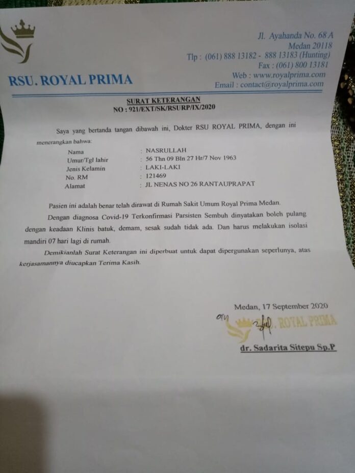 Begitu juga surat keterangan Rumah Sakit Umum Royal Prima No: 921/EXT/ SP/ RSURP/IX/2020 yang di tandatangani dr. Sadarita Sitepu Sp.P pada tanggal 17/9/2020 yang menyatakan atas nama: N (56) tanggal lahir 27 November 1963 yang beralamat di jalan nenas dinyatakan benar pasien yang dirawat di RSU Royal Prima dengan diagnosa Covid-19 terkonfirmasi farsisten sembuh dinyatakan boleh pulang, dengan keadaan klinis batuk, demam dan sesak sudah tidak ada dan harus melakukan isolasi diri selama 7 hari di rumah.