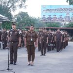 MEDAN-Kepala Kejaksaan Tinggi Sumatera Utara Idianto, SH, MH memimpin Apel Pagi mengawali tahun 2023 di halaman kantor Kejati Sumut Jalan AH Nasution Medan, Senin (2/1/2023).