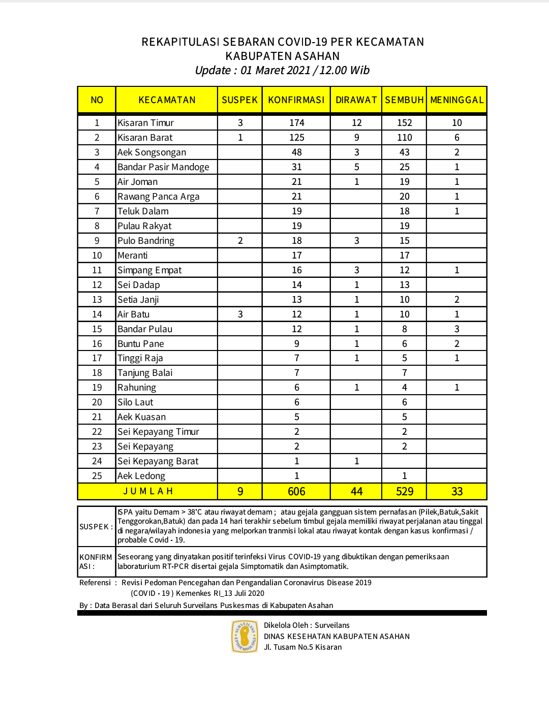 ASAHAN – realitasonline.id  |  Ini Update data terbaru di bulan Maret 2021 warga Asahan terkonfirmasi  Covid-19 sebanyak 606 orang dari 25 kecamatan.