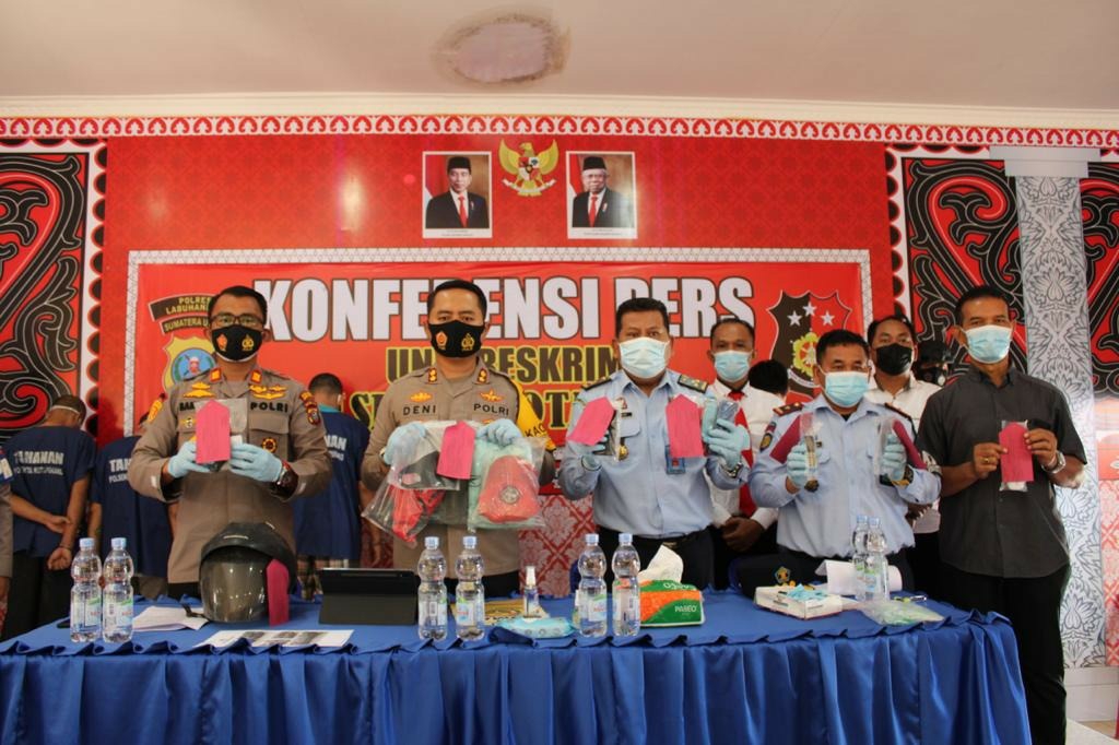 LABUHANBATU- Kapolres Labuhanbatu AKBP Deni Kurniawan pimpin konferensi pers pengungkapan kasus pembakaran Rumah Dinas (Rumdis) Kepala Lembaga Pemasyarakatan (Kalapas) Kelas III Kota Pinang, di ruang lobi Polsek Kota Pinang,  Senin (2/8/2021).