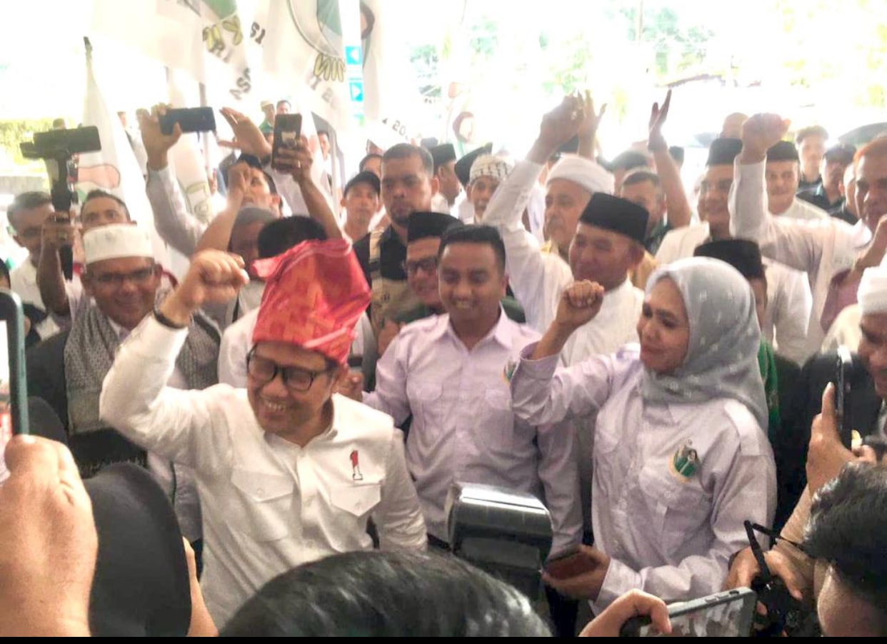 Yel yel PKB Bangkit, Solid dan Menang berkumandang menyambut Capres RI 2024 Gus Muhaimin yang berpakaian Adat Karo dibarengi musik hadrah dan marcing band yang dikawal Ketua Umum Laskar Cak Imin dr Ainul Rahman, Ketua Laskar Cak Imin Sumut Ita Julianti, Sekretaris Dewan Syuro DPW PKB Sumut H Upar Pulungan, Sekretaris Loso Mena dan Bendahara Zaira Ritonga serta Ketua DPC PKB Deli Serdang H Said Hadi.
