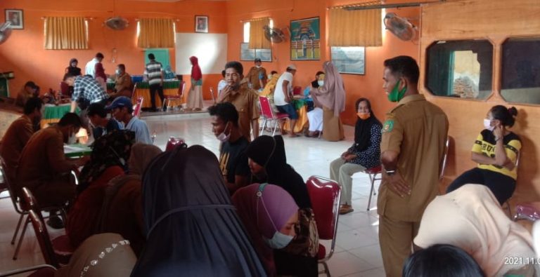 LANGKAT – Ratusan warga Desa Perlis, Kecamatan Brandan Barat, Kabupaten Langkat, antusias berbondong-bondong mendatangi aula kantor desa untuk mengikuti vaksinasi yang terselenggara oleh Puskesmas Tangkahan Durian, Senin (1/11/2021).