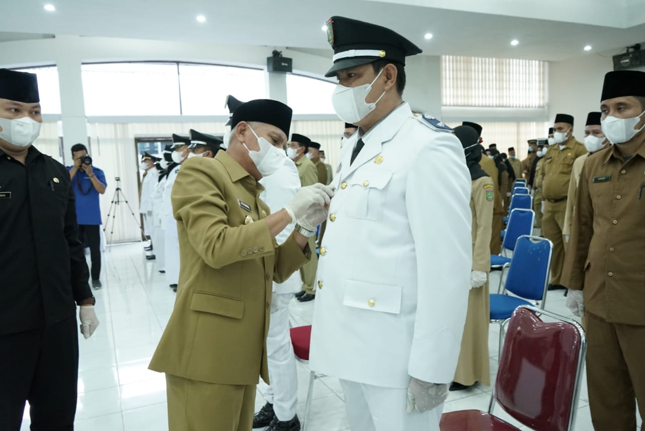 ASAHAN – Lantik Camat dan Lurah, Bupati Asahan H Surya BSc melantik dan mengambil sumpah jabatan ratusan pejabat eselon III dan IV sesuai SK No 50.2-BKD-2021 tentang pemberhentian dan pengangkatan PNS dari dan dalam jabatan administrator dan pengawas, di Aula Melati, Selasa (27/4/2021).