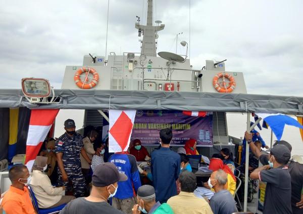 Asahan.Siberindo.co | Ratusan nelayan di wilayah perairan Asahan, Sumatera Utara (Sumut), dijemput TNI AL untuk mendapatkan layanan vaksin Corona. Vaksinasi dilakukan di atas kapal perang TNI AL.