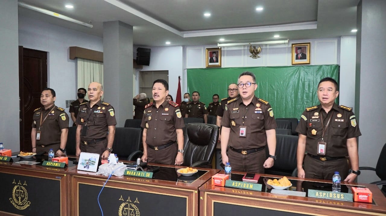 Sementara Wakajati Sumut Asnawi, SH,MH, Aspidum Arief Zahrulyani, SH,MH, Aspidsus Anton Delianto,SH,MH, Aspidmil Kolonel Chk Makmur Surbakti, SH,MH, Kabag TU dan para Koordinator serta para Kasi mengikuti secara virtual dari ruang Vicon Lantai 2 Kantor Kejati Sumut, Rabu (4/1/2023).
