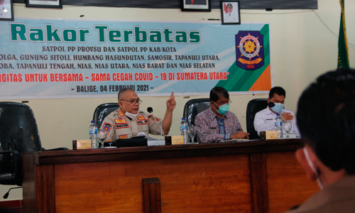 TOBA – Satpol PP Pemprov Sumut menggelar Rapat Kordinasi Terbatas (Rakortas) di Kabupaten Kota Se-Sumut untuk zona tiga. Hal ini merupakan bagian dari upaya menekan penyebaran Covid-19 di Sumut.
