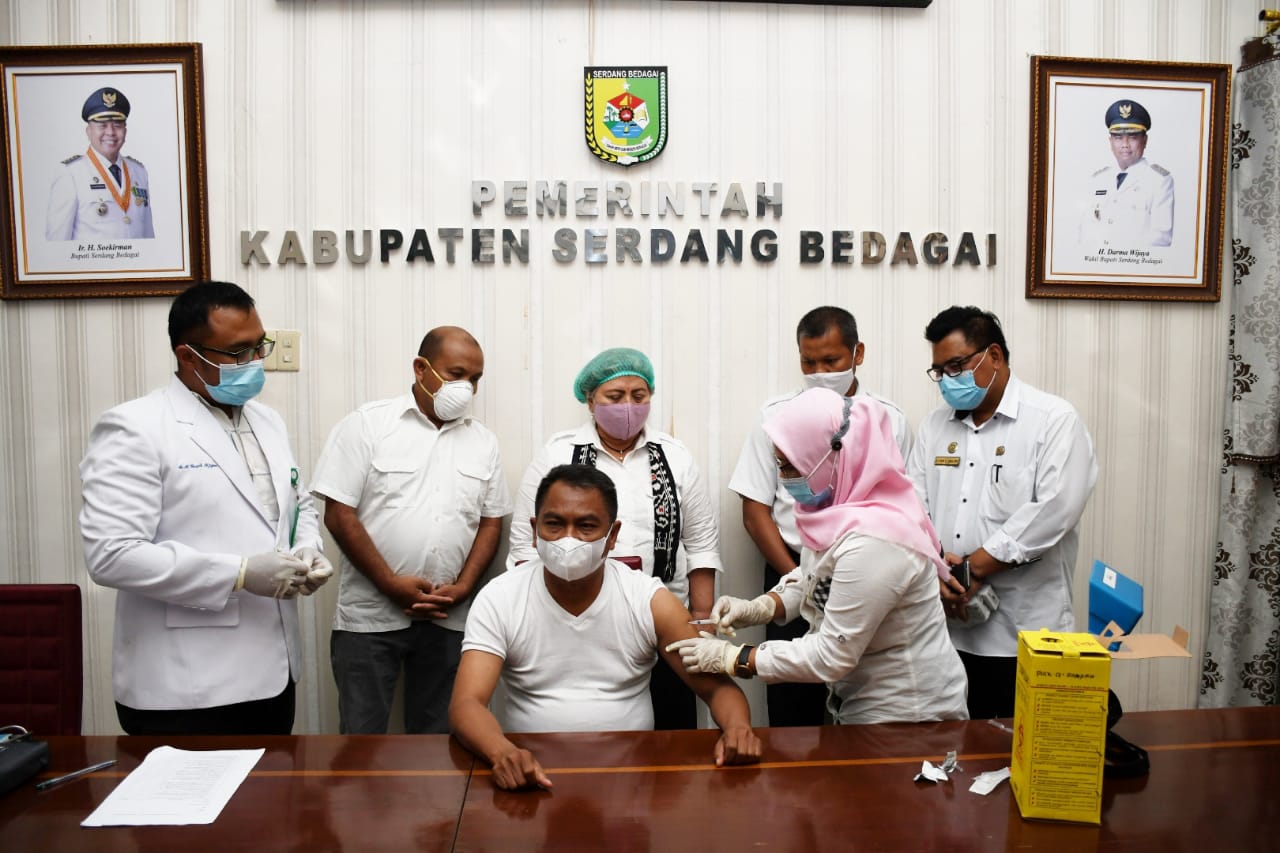 SERDANG BEDAGAI – Wakil Bupati Serdang Bedagai H Darma Wijaya menjadi orang pertama di Kabupaten Sergai yang disuntik Vaksin Sinovac Covid-19 di Ruang Kerja Wabup Sergai H Darma Wijaya Komplek Kantor Bupati Sergai di Sei Rampah, Rabu (3/02/2021).