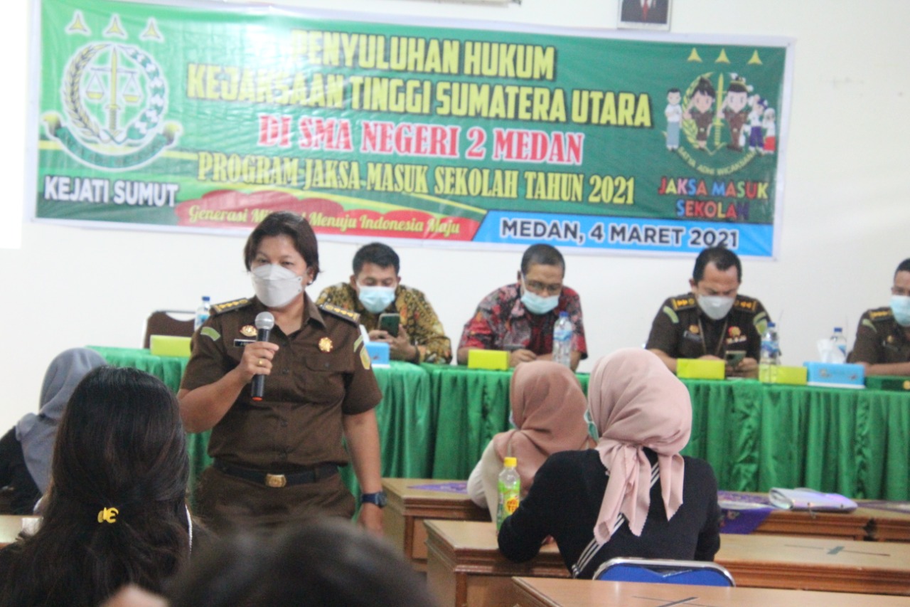 MEDAN-Tim Penkum Kejati Sumut melaksanakan Penyuluhan Hukum di SMA Negeri 2 Medan dalam Program Jaksa Masuk Sekolah. Acara Luhkum, Kamis (4/3/2021) dimulai pukul 09.30 WIB sampai pukul 11.30 WIB di Ruang Guru SMA N 2 Medan Jalan Karang Sari, Polonia Medan.