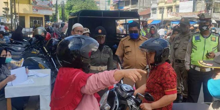 Medan – Guna mengantisipasi penularan Covid-19 di Kota Medan, tim gabungan dari Polsek Medan Area dan Satpol PP Kota Medan menggelar razia masker di seputaran Pasar Sukaramai, Jalan AR. Hakim Kelurahan Sukaramai 1 Kecamatan Medan Area, Senin (3/8/2020).