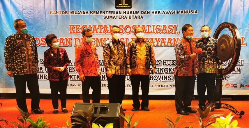 KARO – Bupati Karo Terkelin Brahmana SH MH mendapat kesempatan untuk ‘memukul gong’ sebagai tanda pembukaan program kegiatan Sosialisasi Promosi dan Diseminasi Kekayaan Intelektual.
