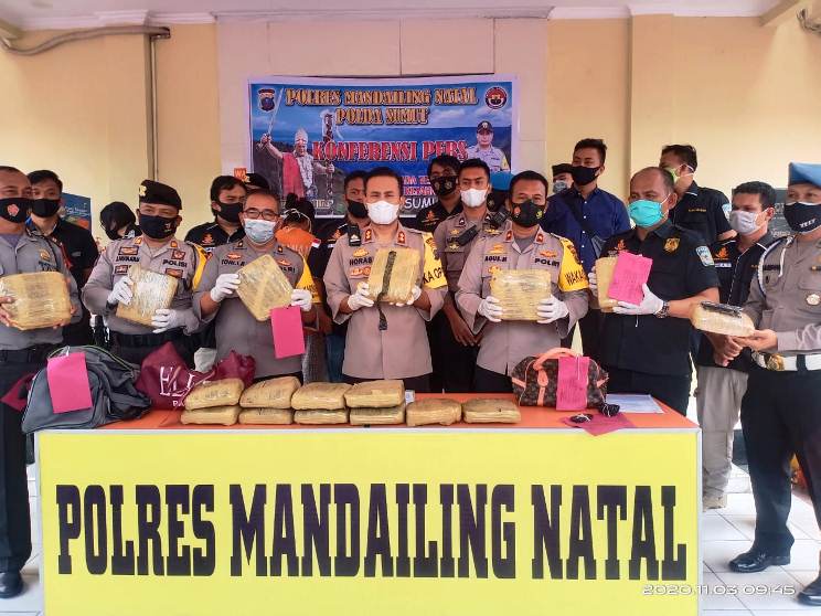 Penangkapan kedua orang tersangka beserta barang bukti 18.2 Kg ganja kering tersebut terungkap pada konferensi pers yang digelar Kapolres Madina AKBP Horas Tua Silalahi SIK. Didampingi Wakil Kapolres Komisaris Polisi Agus Mariyana dan AKP Manson Nainggolan beserta pejabat utama Polres Madina lainnya, Selasa (3/11/2020).