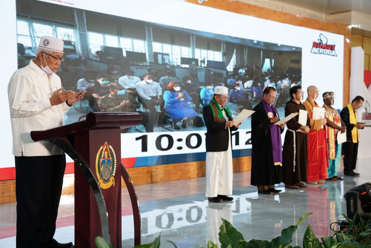 “Dengan doa yang disampaikan enam tokoh agama ini, kita berharap pandemi Covid-19 dan musibah Banjir yang saat ini berlangsung diharapkan cepat berakhir. Pada masyarakat yang telah menghentikan kegiatan selama lima menit atas saran Bapak Gubernur Sumut kami mengucapkan terima kasih,” ucap Maratua.