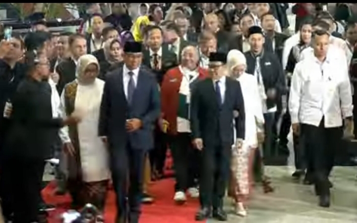 Berpakaian kemeja putih dan jas hitam serta menggunakan peci, Capres RI Pemilu 2024 Anies Baswedan datang didampingi istrinya Ny. Fery Farhati Anies dan bersama Wacapres Muhaimin Iskandar yang juga berkemeja putih dan menggunakan jas hitam serta memakai peci didampingi istrinya Ny. Rustini Murtadho Muhaimin.