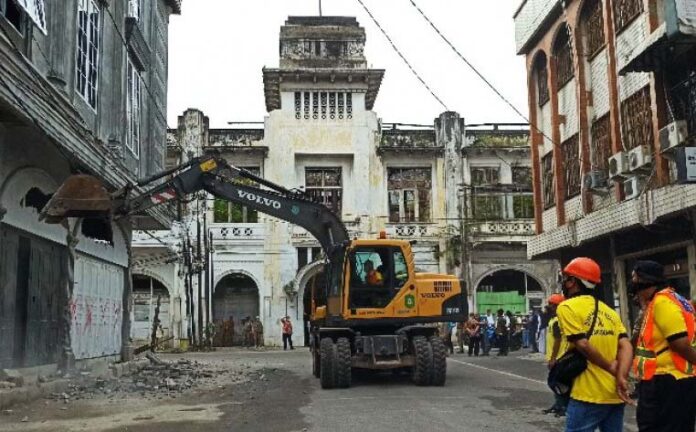 Pantauan realitasonline.id di lokasi, petugas Satpol PP merubuhkan satu bangunan bertingkat tiga yang masih dalan proses pembangunan, dengan menggunakan alat berat eskavator. Bangunan tersebut berada tepat di depan Gedung Warenhuis. Gedung Warenhuis merupakan bangunan supermarket pertama di Medan yang dibangun sekitar tahun 1916.