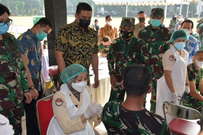 MEDAN – realitasonline.id | Kasdam I/BB, Brigjen TNI Didied Pramudito Tinjau langsung acara pencanangan vaksinasi nasional tahap II terhadap personel Kodim 0201/BS Medan di Lapangan Benteng, Jln Pengadilan Medan, Kamis (4/3/2021).