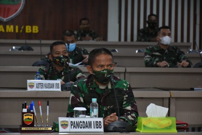 Turut mendampingi Pangdam I/BB melalui Vidcon, Asops Kasdam I/BB, Aster Kasdam I/BB, Pgs. Kapendam I/BB dari ruangan Pusdalops Kodam I/BB. (AY)