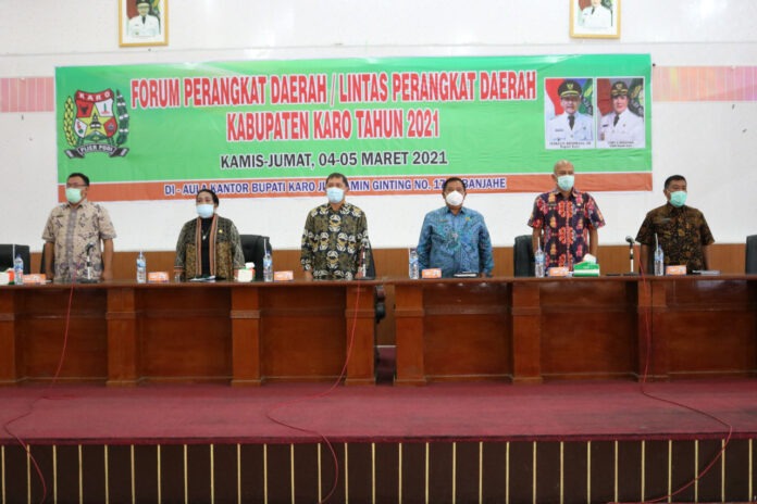 Bupati Karo Terkelin Brahmana dalam sambutannya menyampaikan bahwa forum perangkat daerah/lintas perangkat daerah Kabupaten Karo tahun 2021 ini, merupakan salah satu tahapan dalam menyusun rencana pembangunan tahun 2022 dan sebagai tindak lanjut dari Musrenbang desa dan kecamatan.