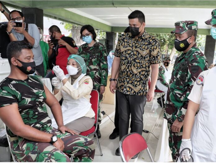 MEDAN – realitasonline.id | Wali Kota Medan, Muhammad Bobby Afif Nasution SE MM meninjau pelaksanaan vaksinasi Covid-19 bagi anggota TNI khususnya Babinsa di jajaran Kodim 0201/BS di Lapangan Benteng Medan, Kamis (4/3/2021).