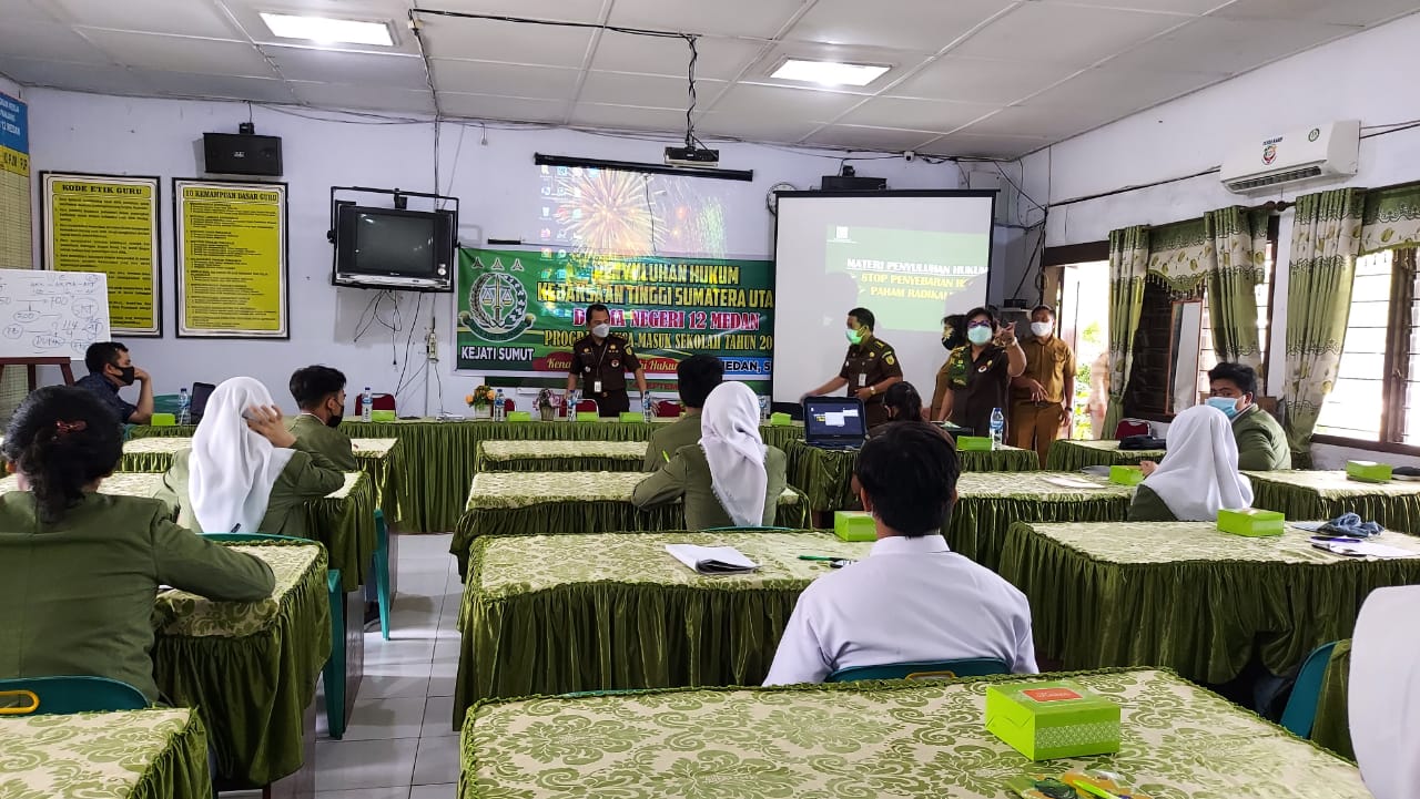 Kasi Penkum Kejatisu didampingi Tim Penkum Kejatisu yang dihadiri Kepala Sekolah SMAN 12 Dra Ade Melinda Banjarnahor didampingi Wakil Kepala Sekolah dan Guru2 serta Siswa/i 20 siswa SMAN 12 Medan.