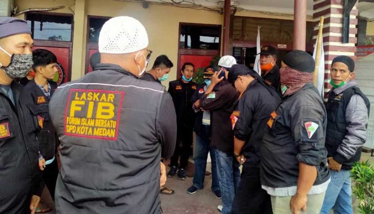 MEDAN – Massa FIB ormas Islam tergabung dalam Forum Islam Bersatu DPC DK Mandala menggelar aksi di Polsek Percut Sei Tuan di Jalan Letda Sujono, Medan, Jumat (26/3/2021) sore.