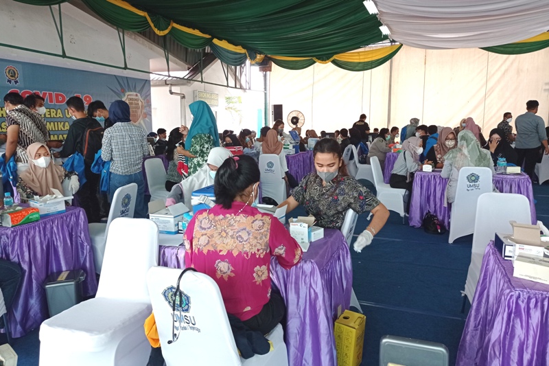 MEDAN  –  Universitas Muhammadiyah Sumatera Utara (UMSU) kembali menggelar kegiatan vaksinasi untuk mahasiswa dan masyarakat umum. Kali ini UMSU menggelar vaksin selama dua hari berturut-turut.  Hari ini, Selasa (5/10) vaksinasi diakukan bekerjasama dengan Polda Sumatera Utara sedangkan pada Rabu (6/10) kerjasama dengan Kodam I/BB. Pelaksanaan dua hari vaksinasi ini berlangsung di Kampus Pascasarjana, Jln Denai, Medan.