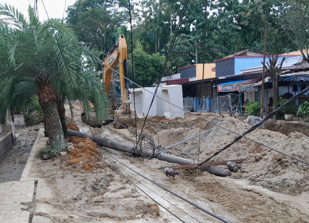 Warga setempat, berinisial Din (46), menyebutkan, tiang listrik tersebut tumbang akibat terkena sabetan alat berat (becko) saat melakukan pengerukan drainase, Minggu, sekira pukul 11.02 Wib.