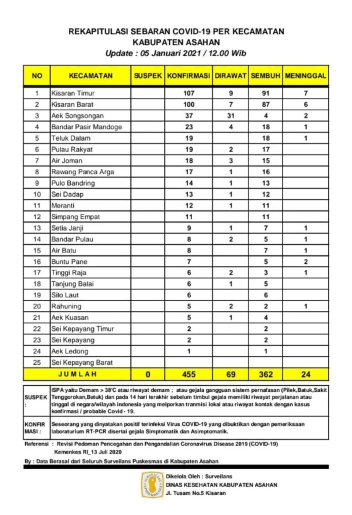 Data Update tersebut disampaikan Juru Bicara Gugus Tugas Percepatan Penanganan Covid – 19 Kabupaten Asahan H. Rahmat Hidayat Siregar S. Sos. M.Si, berdasarkan hasil data surveilans dari seluruh Puskesmas yang ada di wilayah Kabupaten Asahan sebagaimana di kelola Dinas Kesehatan Kabupaten Asahan pertanggal 05 Januari 2021 hingga pukul 12.00 Wib, Selasa (05/01/2021).