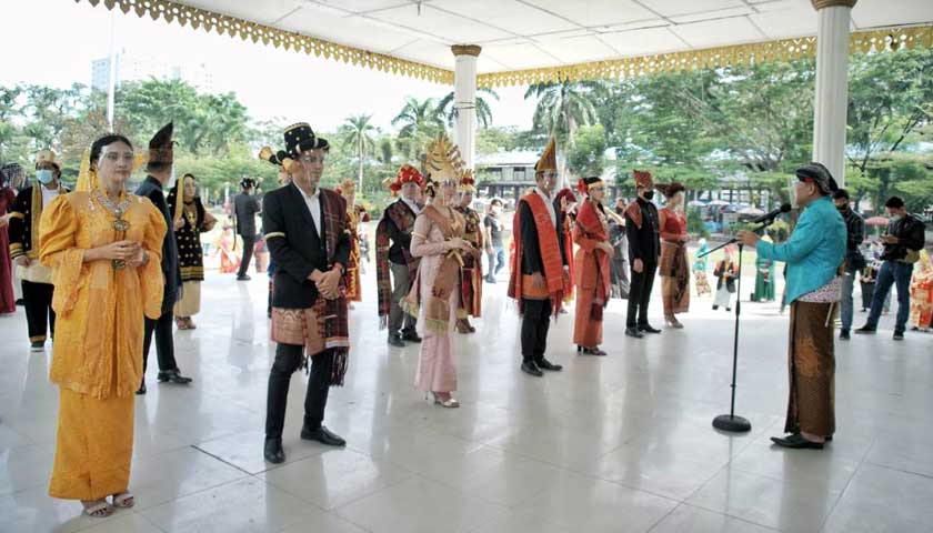 MEDAN – Pemandangan yang tidak biasa terlihat dari di pelataran Pendopo Lapangan Merdeka, Medan, Senin (4/1/2020) pagi. Pasalnya, seluruh staf Dinas Pariwisata Kota Medan ramai mengenakan pakaian adat dari berbagai etnis di Kota Medan dalam rangka Apel Perdana sekaligus Deklarasi Pariwisata Kesiapan Industri Pariwisata Kota Medan di Era Adaptasi Kebiasaan Baru dengan melaksanakan penerapan protokol kesehatan CHSE atau K4 yakni Cleanliness (Kebersihan), Health (Kesehatan), Safety (Keamanan), dan Environmental Sustainability (Keberlangsungan Lingkungan) sebagaimana yang sedang dikampanyekan oleh Kementerian Pariwisata dan Ekonomi Kreatif Republik Indonesia (Kemenparekraf RI).