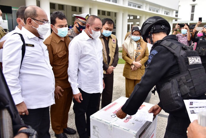 Vaksin Sinovac tersebut tiba di Bandar Udara Internasional Kualanamu, Kabupaten Deliserdang, Selasa (5/1) pagi. Dengan pengawalan dari personel Brimob, usai diterima Gubernur di rumah dinas, vaksin langsung disimpan di gudang penyimpanan milik Dinas Kesehatan Sumut di Jalan HM Yamin Medan.