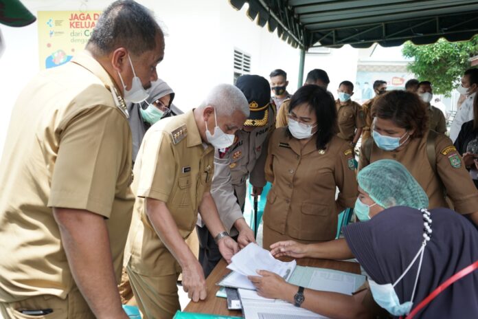ASAHAN – realitasonline.id | Memastikan kegiatan vaksinasi Covid 19 berjalan dengan baik, Bupati Asahan H Surya BSc bersama Wakil Bupati Taufik Zainal Abidin SSos MSi, Kapolres Asahan, Dandim 0208/AS, Kajari Asahan/Mewakili, Ketua PN, Danlanal TB/AS, Danyonif 126/KC serta OPD terkait turun langsung meninjau proses pelaksanaan vaksinasi di Puskesmas Mutiara, Puskesmas Gambir Baru dan Puskesmas Sidodadi, Senin (5/4/2021).