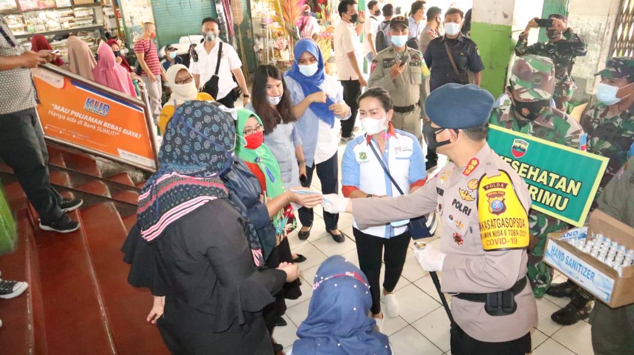 Dansat Brimob bersama Kapolsek Medan Kota, Wadanramil 04 Medan Kota dan Kasi Dinas Pariwisata Kota Medan, Kombes Pol Suheru membagikan masker dan handsanitizer di Pusat Pasar Medan Mall Jalan Pusat Pasar Kecamatan Medan Kota.