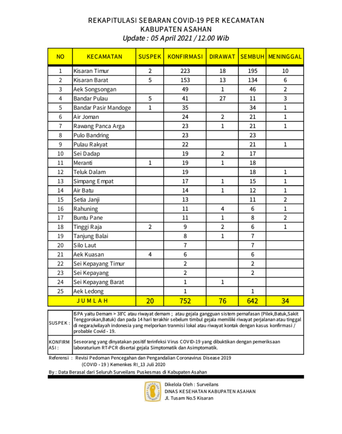 Satuan Tugas Percepatan Penanganan Covid – 19 Kabupaten Asahan H. Rahmat Hidayat Siregar S. Sos. M.Si , senin (05/04/2021) berdasarkan hasil data surveilans dari seluruh Puskesmas yang ada di wilayah Kabupaten Asahan sebagaimana di kelola Dinas Kesehatan Kabupaten Asahan pertanggal 05 April 2021 hingga pukul 12.00 Wib.