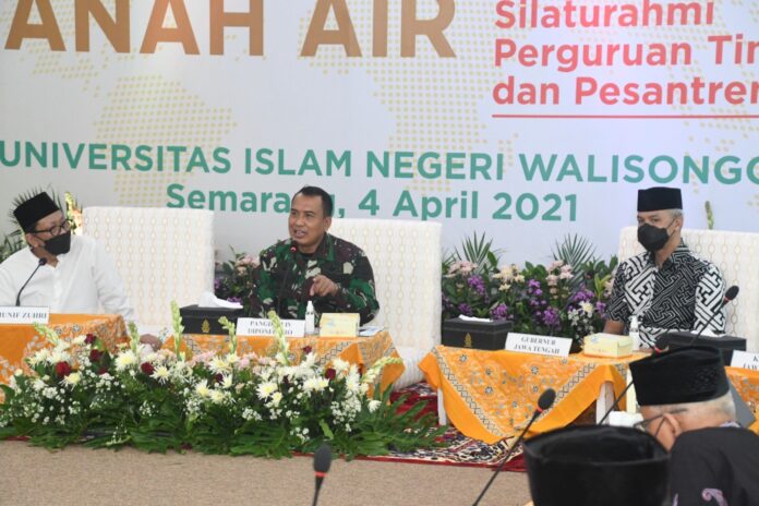 SEMARANG – realitasonline.id | Potensi ancaman kedaulatan negara harus diantisipasi seluruh komponen bangsa, hal itu disampaikan Pangdam IV/Diponegoro Mayjen TNI Rudianto saat menjadi narasumber utama (keynote speech) pada acara focus Group Discussion IV Forum Silahturahmi Perguruan Tinggi dan Pesantren bertempat di Gedung Rektorat Baru lantai 4 Kampus 3 UIN Walisongo Jl Prof Dr Hamka No 3-5 Tambakaji Kecamatan Ngalian Kota Semarang, Minggu (4/4/2021).