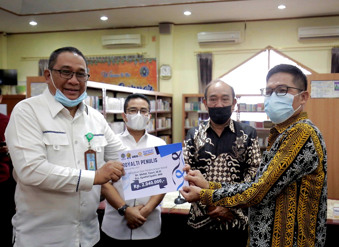 MEDAN – Penulis Buku Kebijakan dan Perencanaan Sosial di Indonesia Dr Mohd Yusri MSI dan Drs Syaiful Syafri MM hibahkan royalti dari hasil penjualanan buku di Shopee kepada Kepala UMSU Pres Muhammad Arifin SPD, MPD disaksikan Rektor UMSU yang diwakili Wakil Rektor II Assoc Prof Dr Akrim MPD di gedung Perpustakaan UMSU Jln Muctar Basri Medan 04/05.