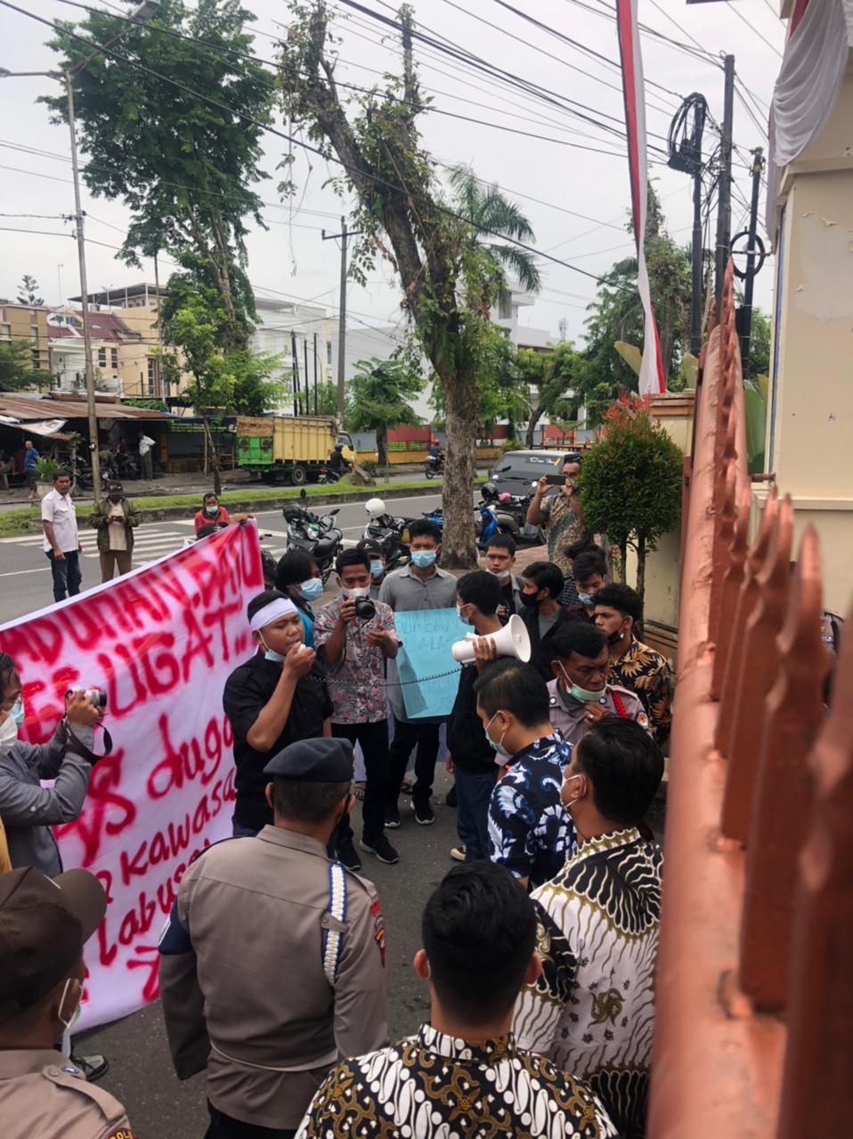 Massa melakukan aksi unjuk rasa menduga pihak PTPN 3 telah melakukan pelanggaran hukum terhadap HGU yang berada di kawasan Hutan Sosial di Kabupaten Labuhanbatu Selatan.