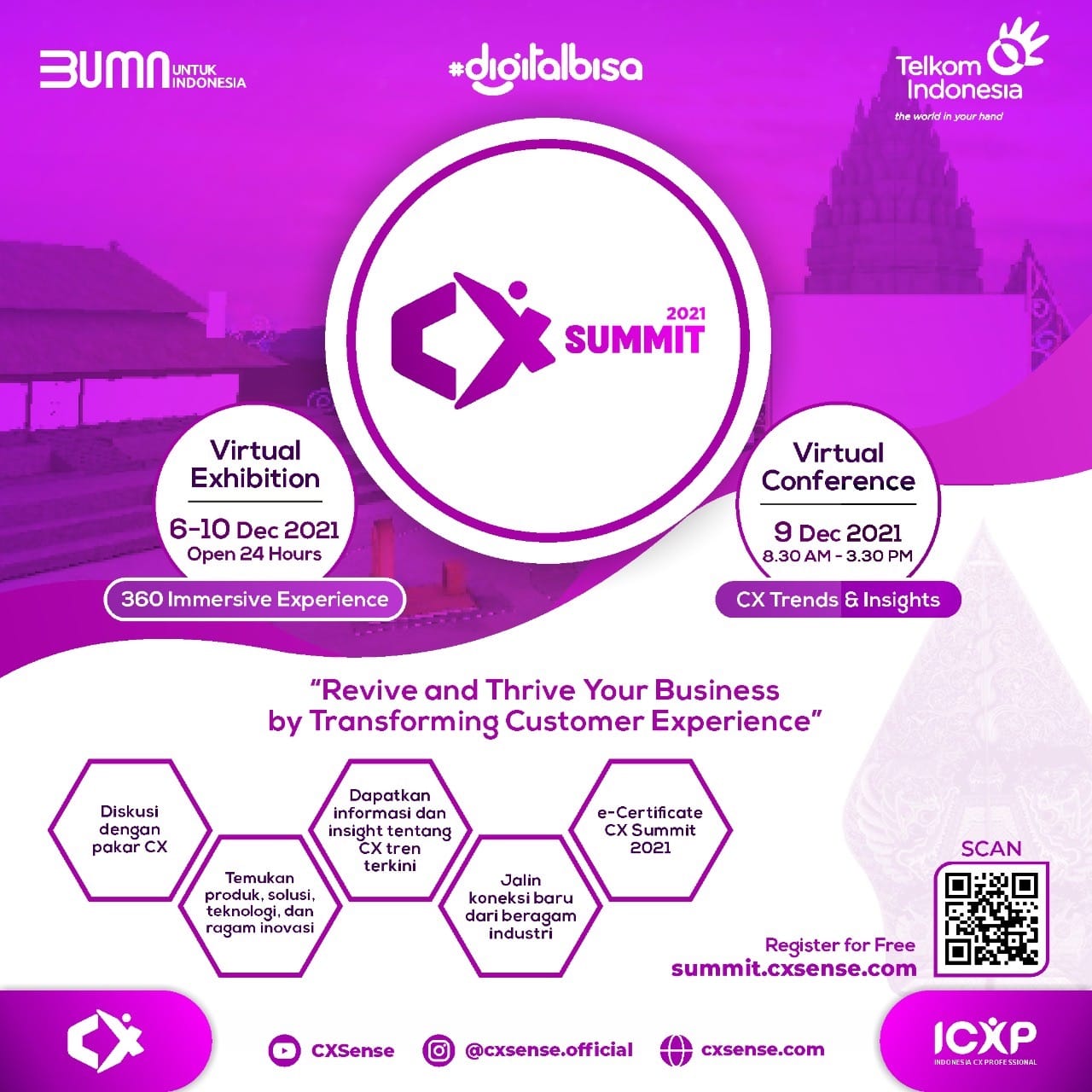 Acara CX Summit 2021 yang diselenggarakan secara online ini, direncanakan akan menjadi event CX Summit terbesar dan pertama kalinya di Indonesia yang menghadirkan virtual conference serta pameran virtual (virtual exhibition) dengan tampilan 3D dan 360 derajat yang akan memberikan pengalaman baru bagi para pengunjung pameran pada tanggal 6-10 Desember 2021.