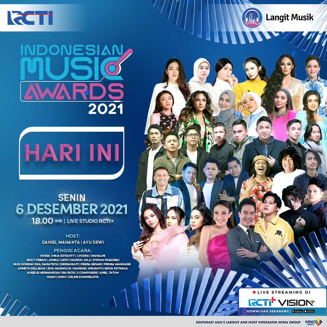 Jangan sampai terlewat untuk menyaksikan malam puncak Indonesian Music Awards, live dari Studio RCTI+, pada hari Senin, 6 Desember 2021, pukul 18.00 WIB. Maju terus musik Indonesia!