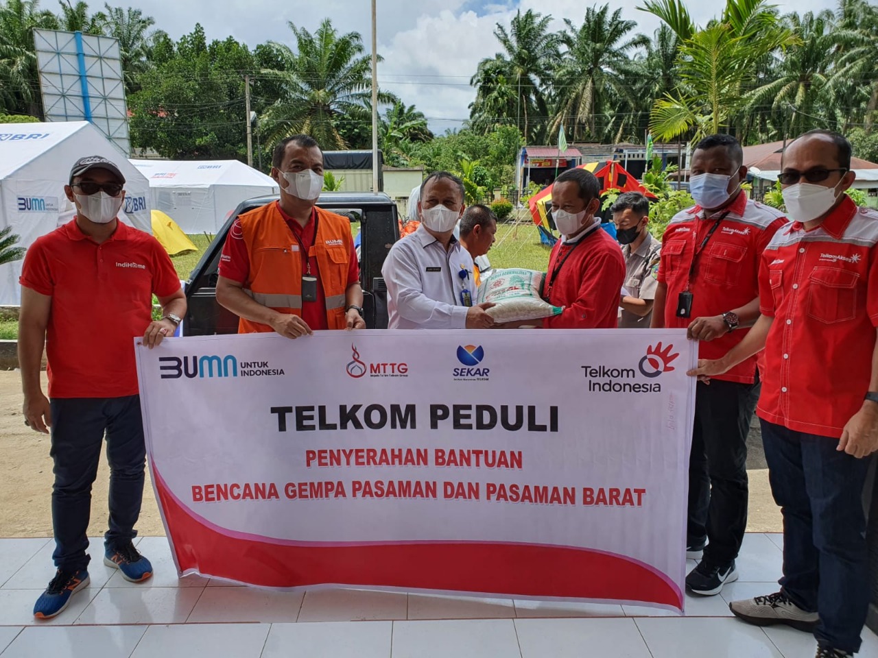 Penyerahan bantuan dilakukan oleh General Manager Telkom Witel Sumatera Barat Alfi Sumarta mewakili Tim TJSL PT Telkom kepada Sekretaris Kecamatan Tigo Nagari Pasaman Barat di Posko Utama Rumah Bupati Pasaman Barat.