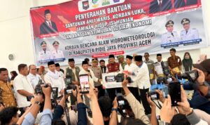 Kegiatan bertajuk “Penyaluran Bantuan Santunan Ahli Waris, Korban Luka, Jaminan Hidup, Isi Hunian, dan Bantuan Stimulan Ekonomi Kepada Korban Bencana Alam Hidrometeorologi di Kabupaten Pidie Jaya Provinsi Aceh” ini dihadiri langsung oleh dua menteri kabinet pemerintah pusat.