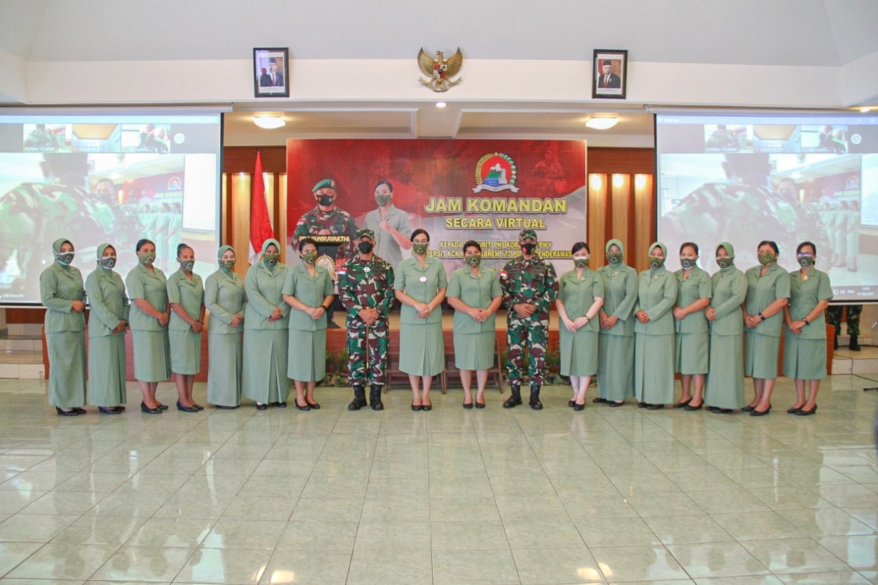 ABEPURA-Korem 172/Praja Wira Yakti melaksanakan “Jam Komandan” yang digelar secara virtual, dan diikuti oleh seluruh satuan di jajaran Korem 172/PWY, termasuk Satuan Tugas (Satgas) Kolakops Korem 172/PWY dan isteri Prajurit yang berada di luar Papua, bertempat di aula Makorem, Rabu (7/3/2021).