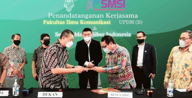 Penandatanganan kerjasama UKW SMSI-UPDM dilakukan Ketum SMSI Firdaus dan Dekan Fakultas Ilmu Komunikasi UPDM Dr Yoga Prasetya Santoso MSi dengan disaksikan oleh Ketua Jurusan Komunikasi UPDM Dr Wahyudi Pratama, Ketua Program Studi Jurnalistik Nasrullah MSi, dan Kepala Bagian Umum Habib Umar.