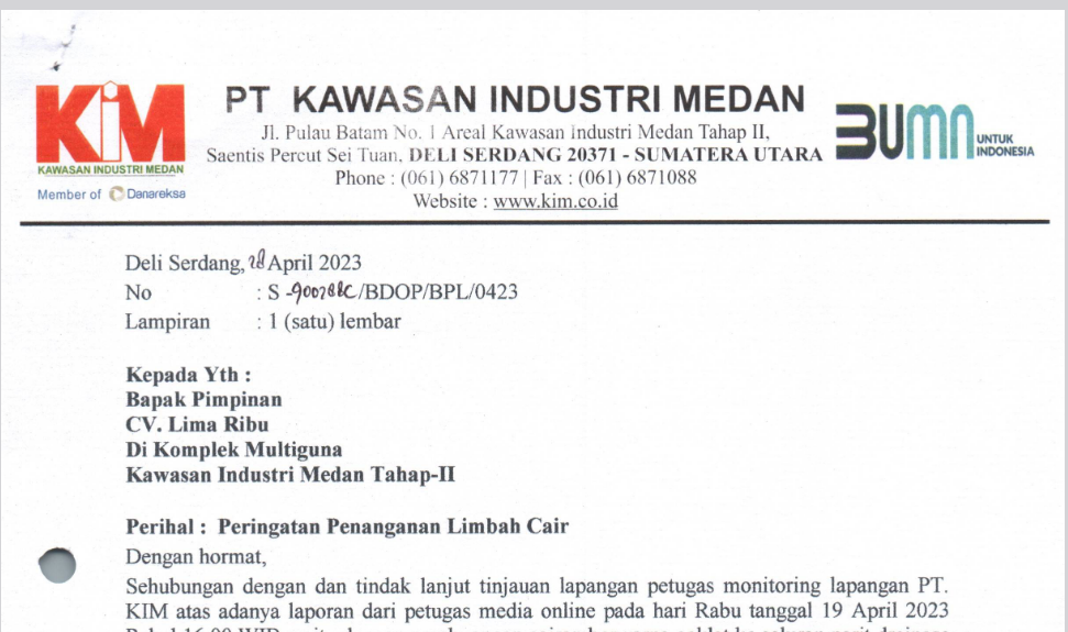 Data yang diperoleh wartawan, tanggal 28 April 2023 Dirut PT KIM Persero melalui Direktur Pengembangan dan Operasional PT KIM Persero M Hita Tunggal atasnama Pengelola Lingkungan sesuai surat nomor S-900288C/ BDOP/BPL/0423 perihal peringatan penanganan limbah cair dilayangkan kepada manajemen CV Lima Ribu.