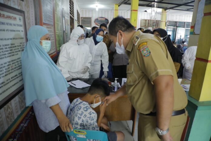 ASAHAN – realitasonline.id | Taufik Zainal Abidin Siregar SSos MSi, selaku wakil bupati Asahan bersama unsur Forkopimda diantaranya Kapolres Asahan(mewakili), Dandim 0208/AS(diwakili), Kajari Asahan, Ketua PN(mewakili), Danlanal TB/AS, Danyonif 126/KC, serta Kepala Dinas Kesehatan Kabupaten Asahan dr. Elfina br.Tarigan, MKT, meninjau proses pelaksanaan vaksinasi massal di beberapa Puskesmas yakni, Mutiara, Gambir Baru dan Sidodadi, Senin (7/6/2021). Peninjauan tersebut guna memastikan kegiatan vaksinasi massal Covid-19 berlangsung dengan baik.