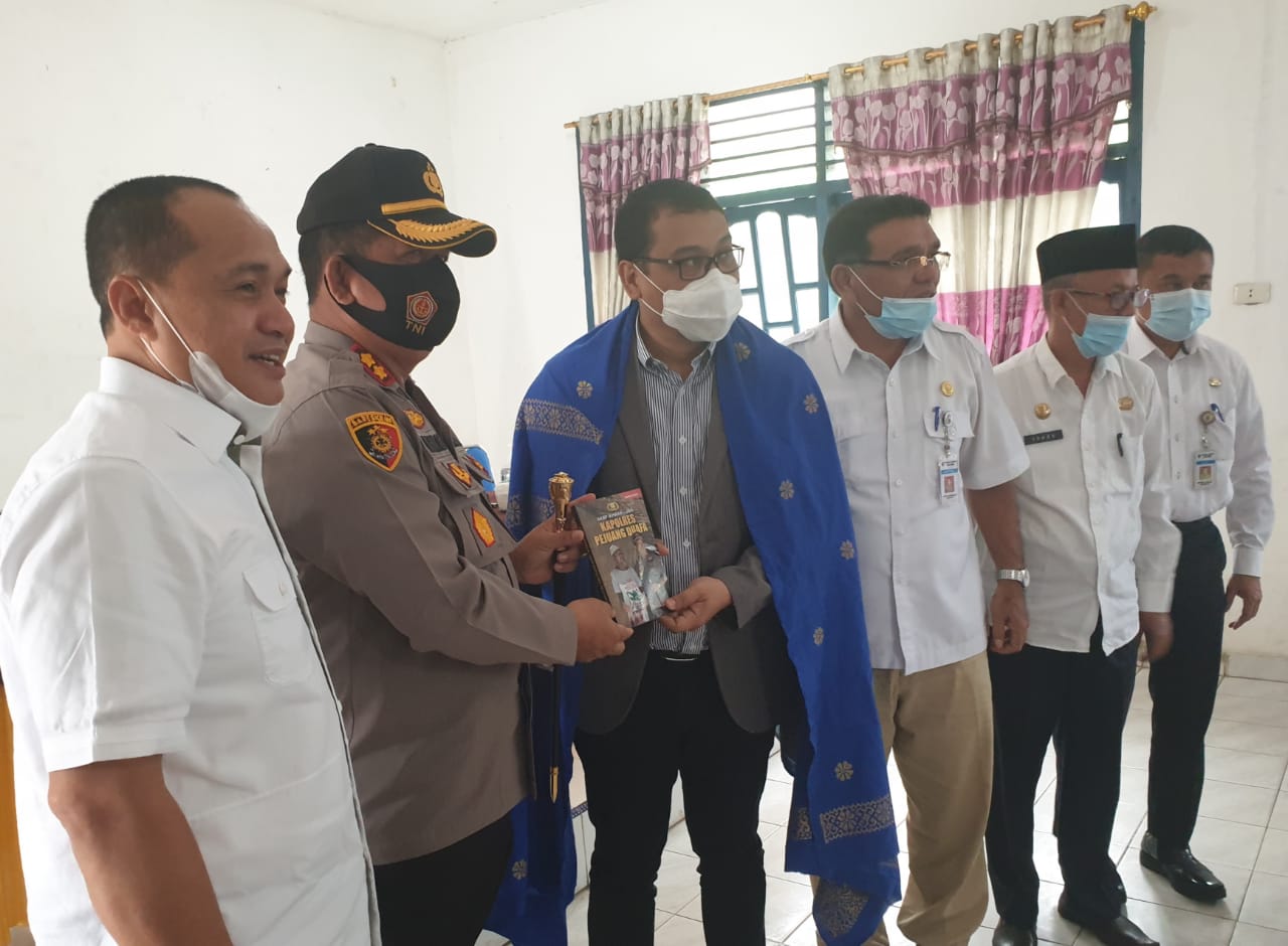 LIMA PULUH – Kapolres Batu Bara AKBP Ikhwan Kubis SH, MH didampingi Bupati Ir H Zahir M.AP, Sekda Sakti Alam Siregar SH dan Kadis Sosial Ishak SPd memberi cendramata berupa buku Kapolres Pejuang Duafa kepada Pembantu Rekttor III UMSU Dr Rudianto SH, MH di Lima puluh 07/10.